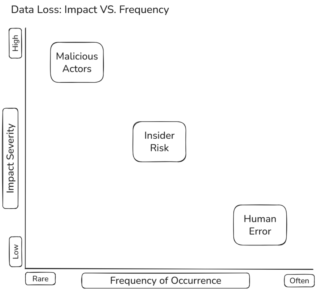 Insider risk sits in the middle of the frequency vs. impact curve – less common than human error, but far more damaging when it happens. Unlike accidents, these incidents often involve intent: an employee misusing legitimate access to steal, leak, or sabotage sensitive data.